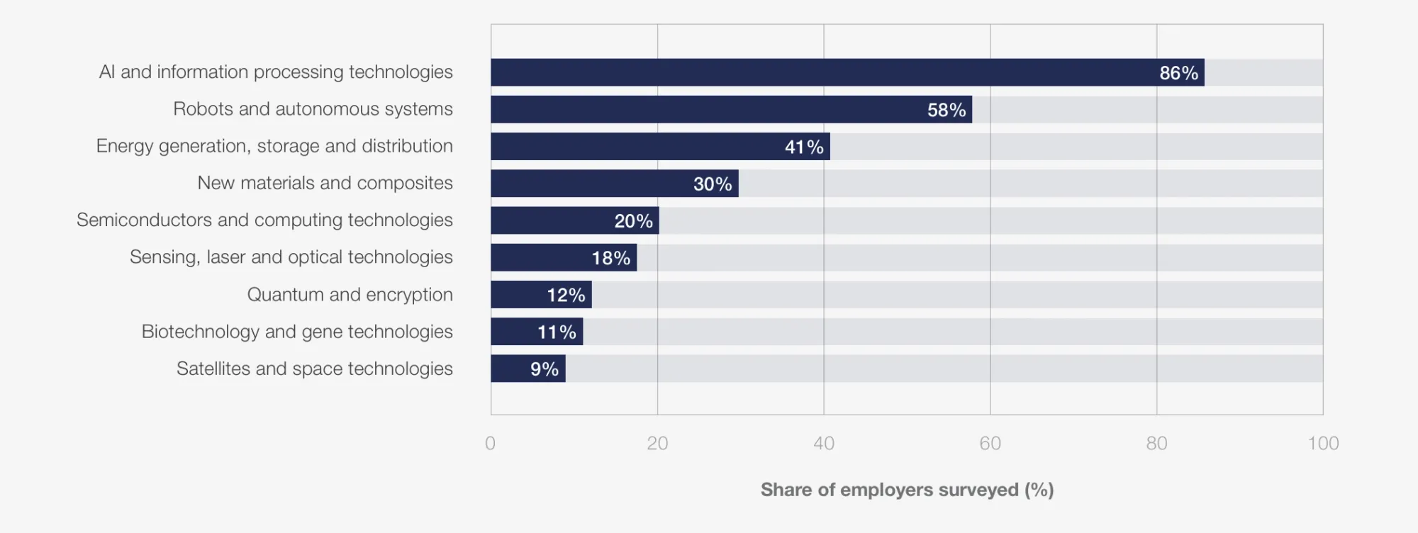 AI, including genAI and agentic systems, is the most widely expected disruptor. In the WEF survey, 86 percent of employers expect AI and information processing to transform their business by 2030. See Figure 1.2 in Future of Jobs 2025.
